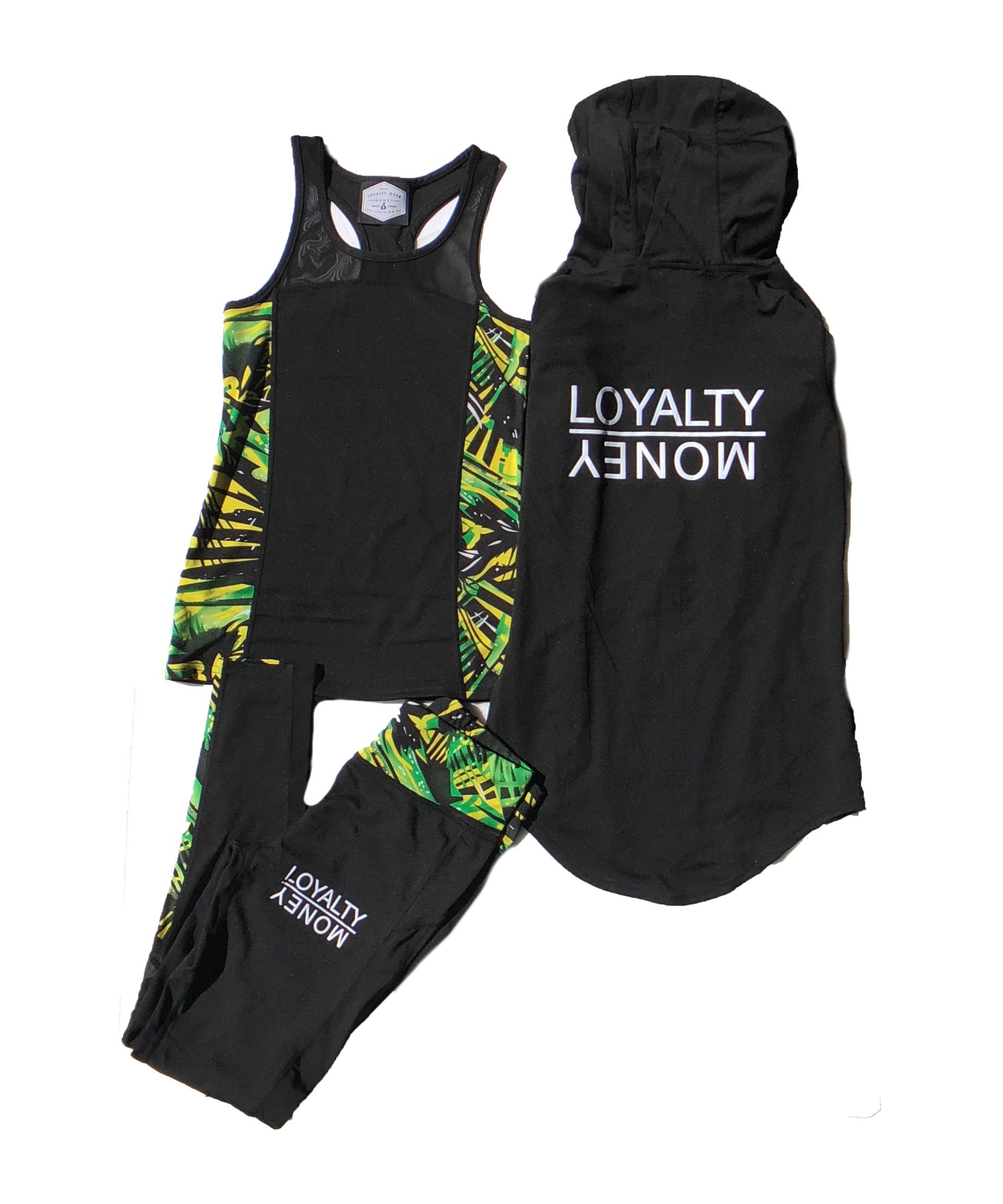3 piece long sleeve hooded women’s yoga suits.black/white/lime green/dark green and yellow with loyalty over money on the back and on the front of the pants