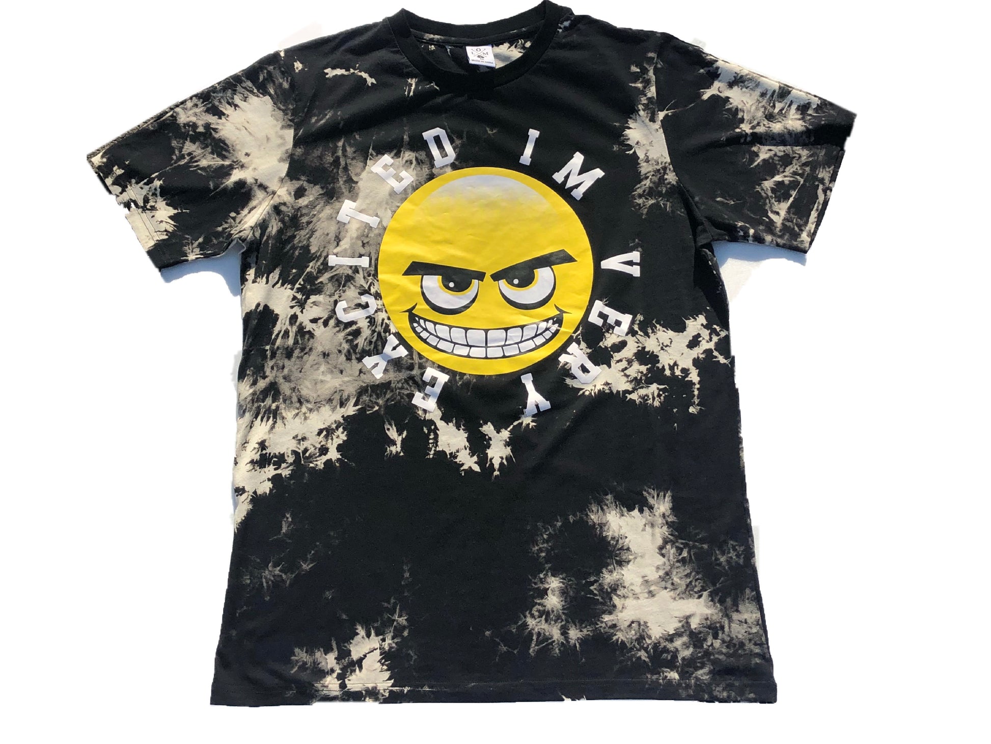 Black/cream with the I’m Very Excited Emoji face on the front.sizes runs a little big