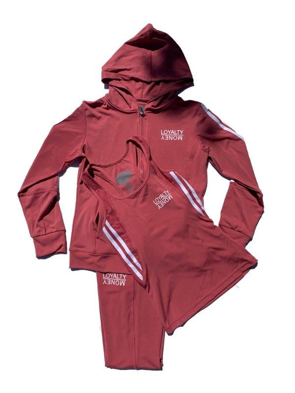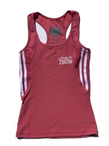 Pink with white strips on the sleeves And white strips on the legs with a white loyalty over money logo.super comfortable fit.