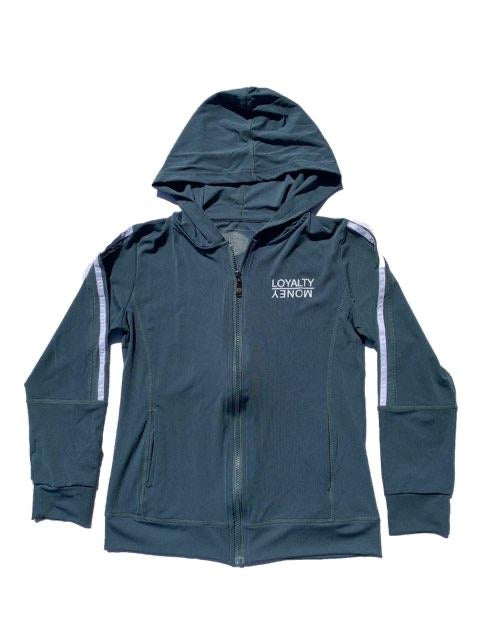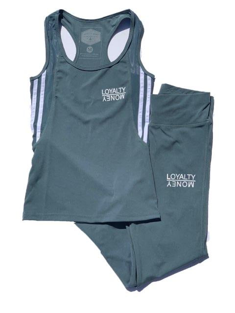 Teal green 3 piece yoga set with white strips on the arms and legs.with a white loyalty over money logo on jacket,shirt and pants..very comfortable fit..
