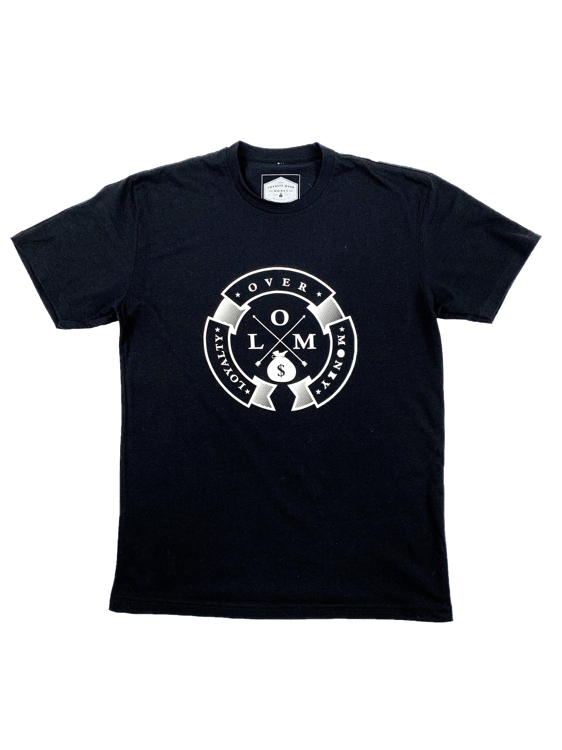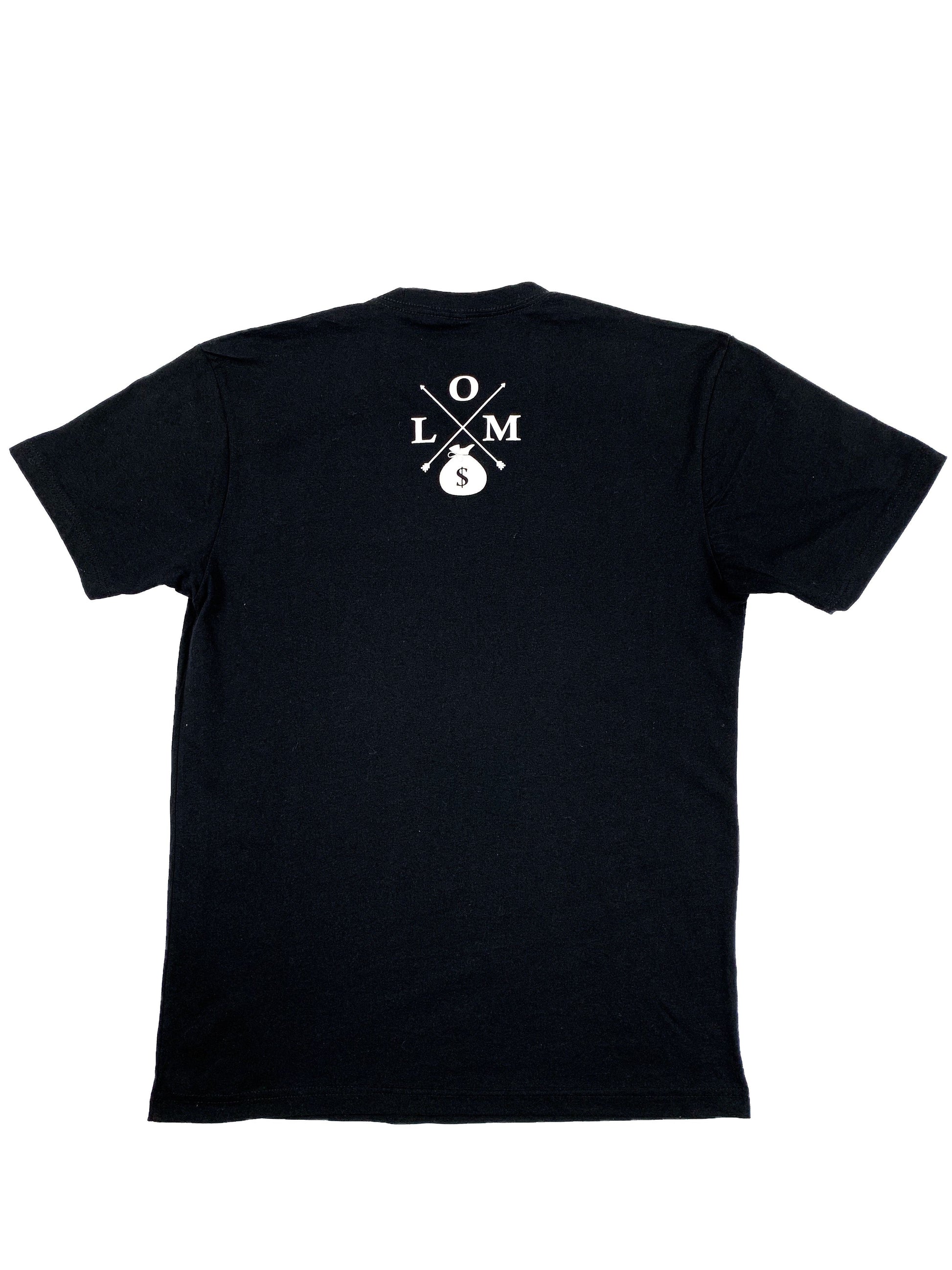 Black new logo lom shirts with the lom logo on the back