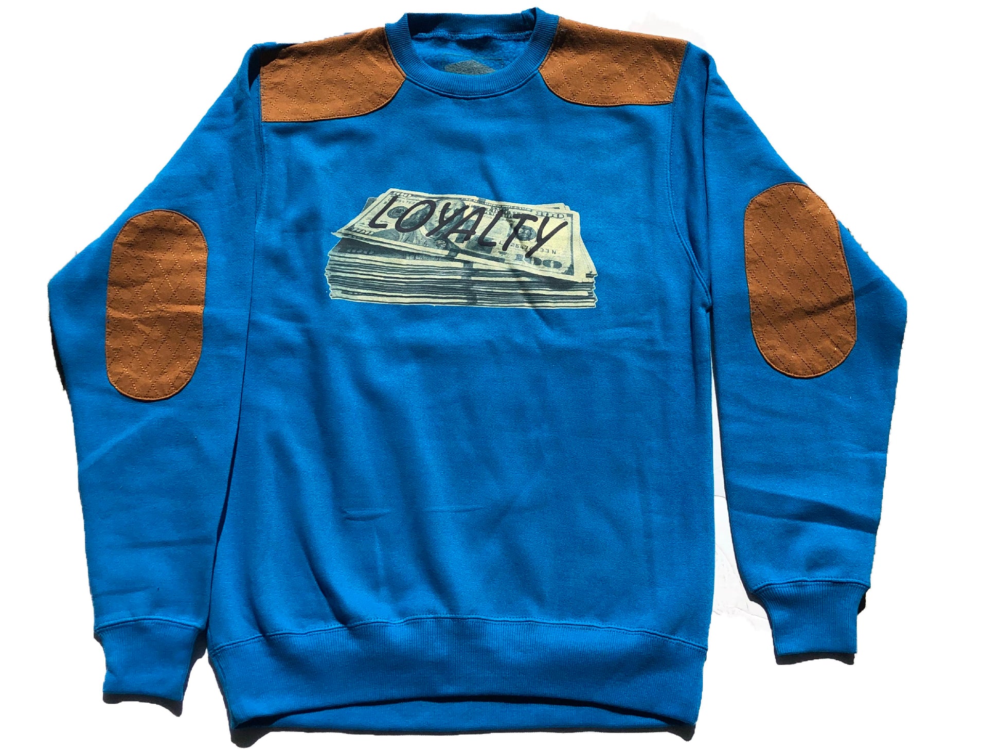 New logo loyalty over money crewneck.Turquoise blue with brown patches