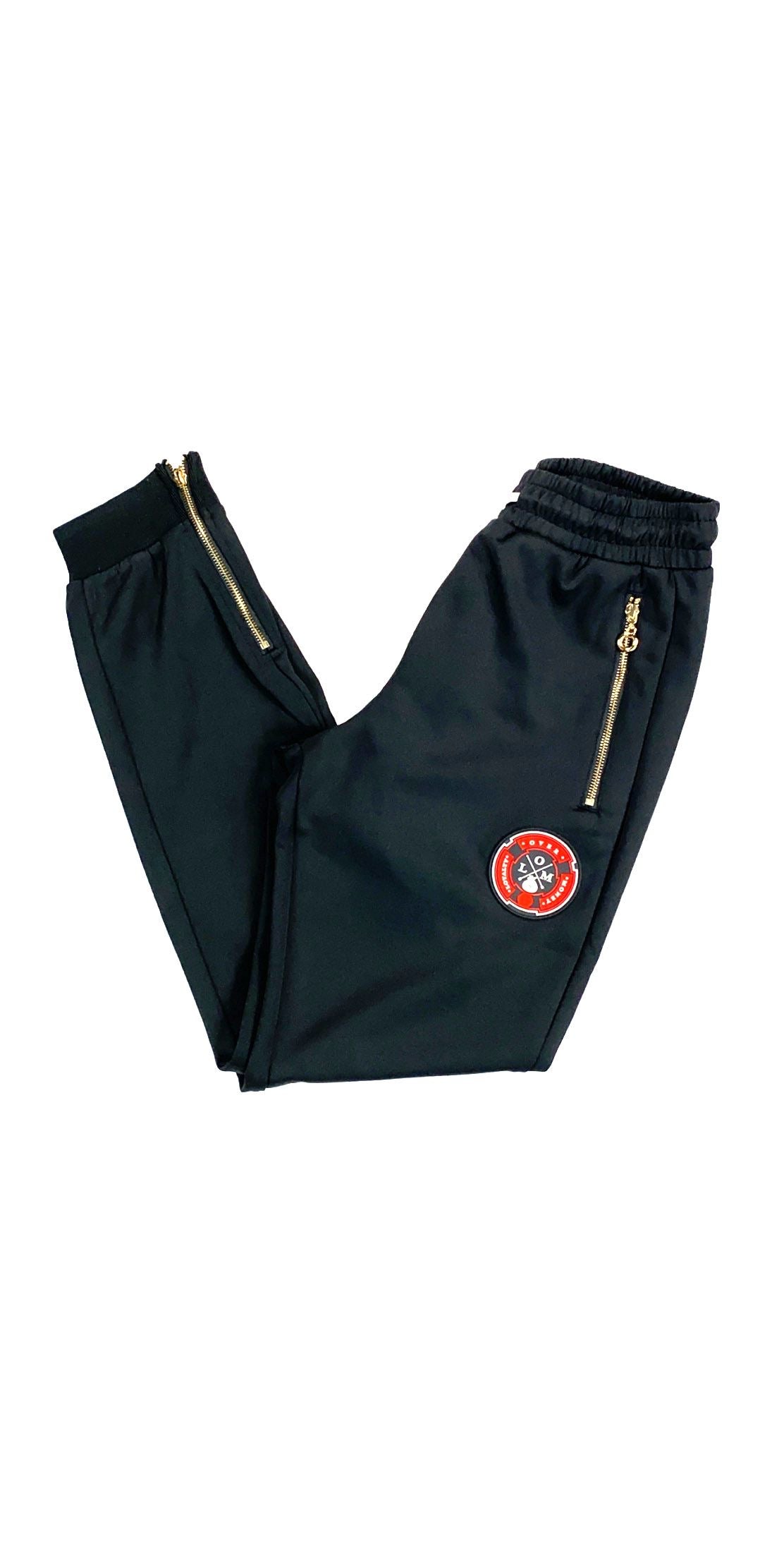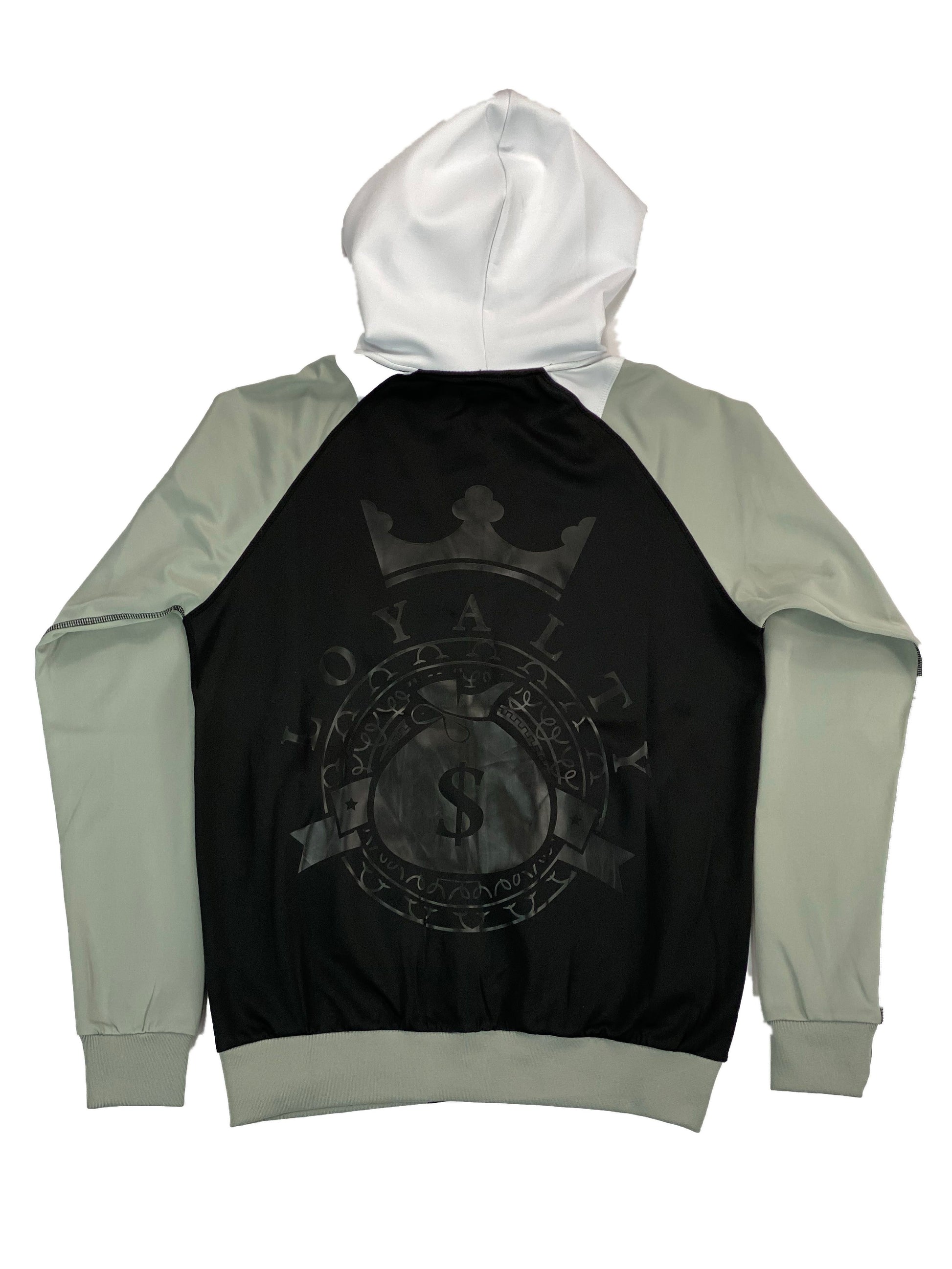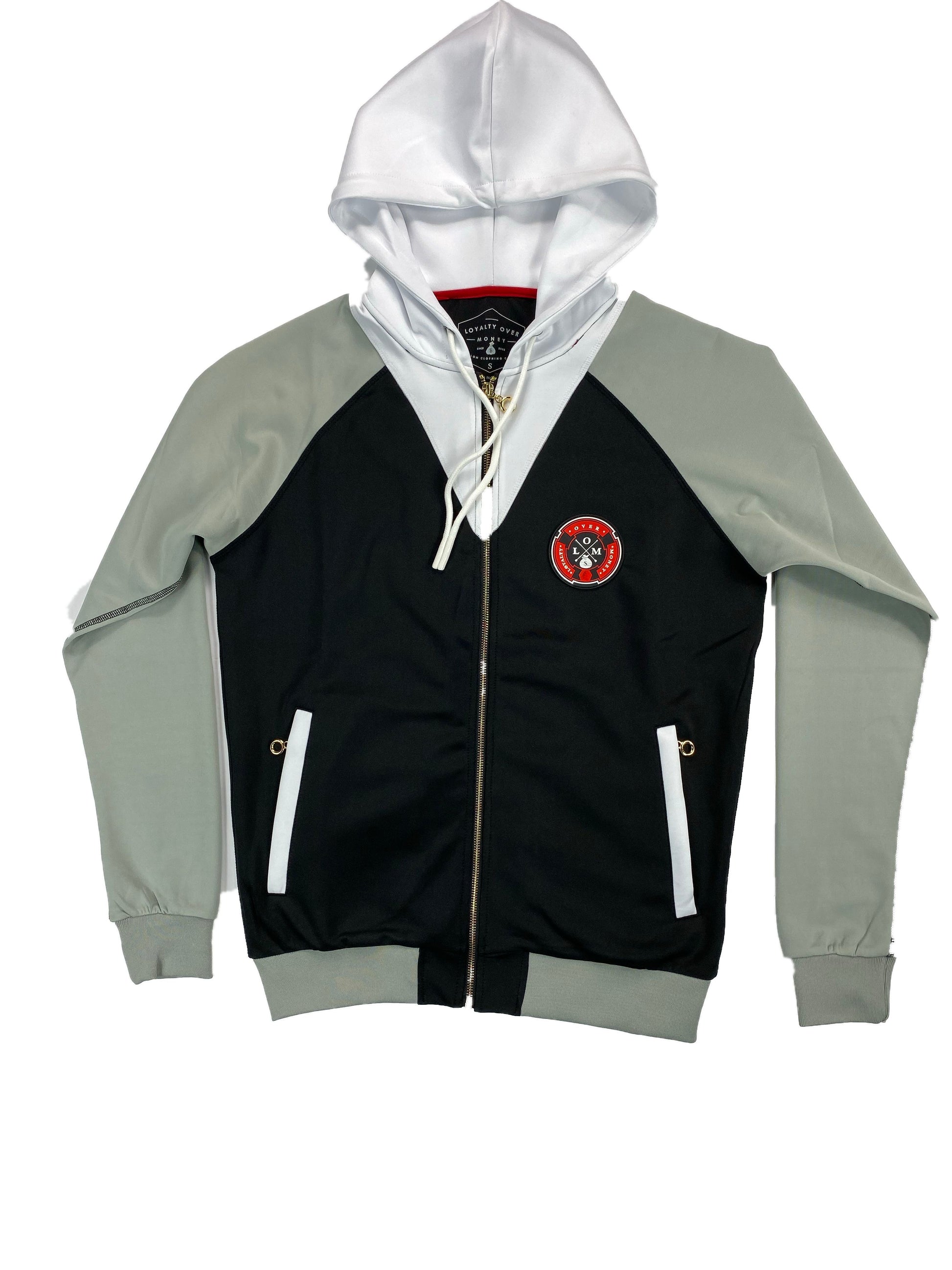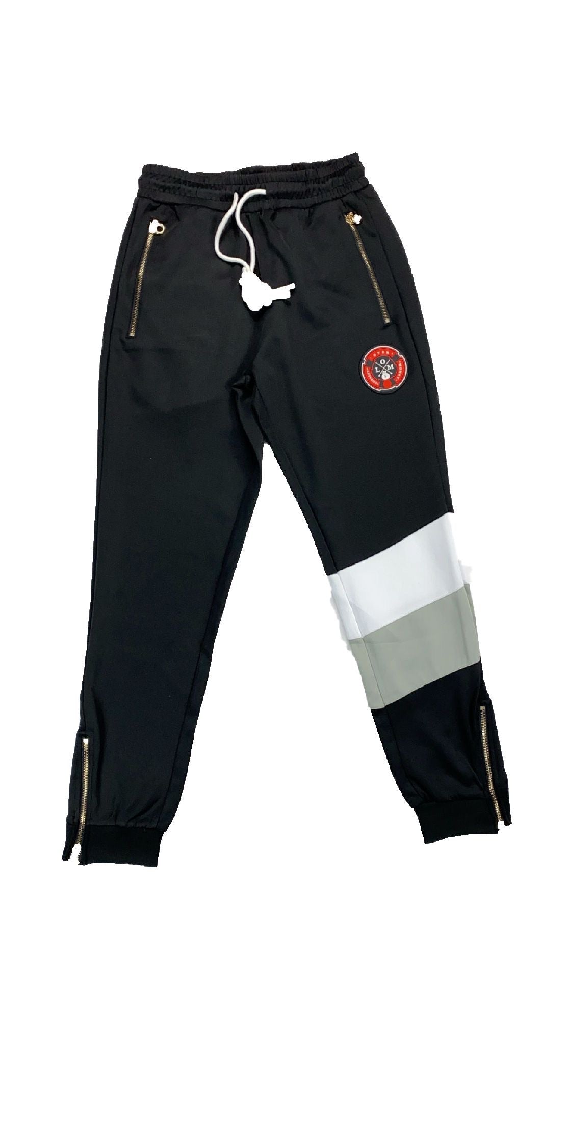 Black/grey and white new style loyalty over money sweatsuits.reflective logo on the back.gold zippers with gold zippers on the bottom of the pants.with back pocket on the right side