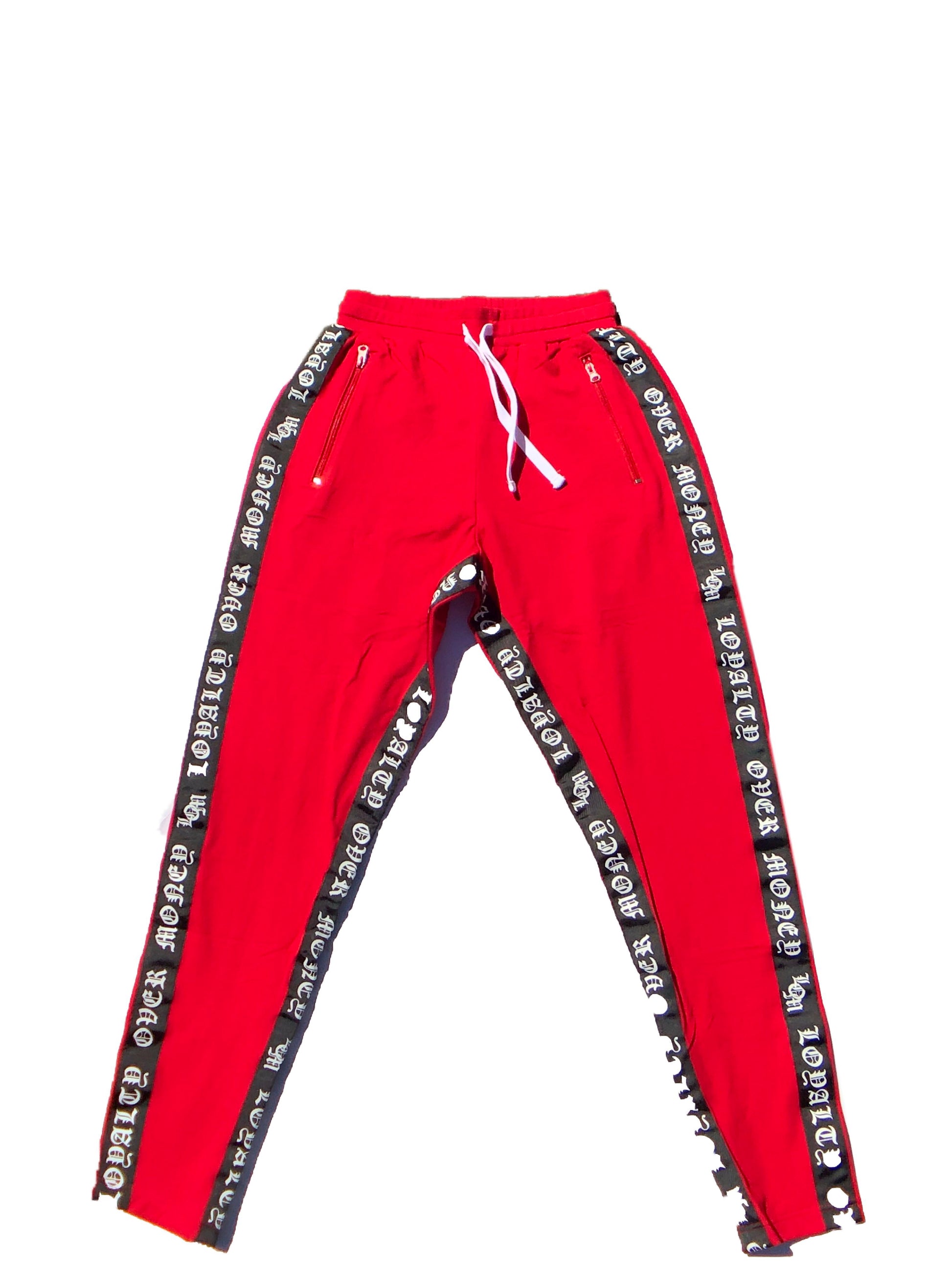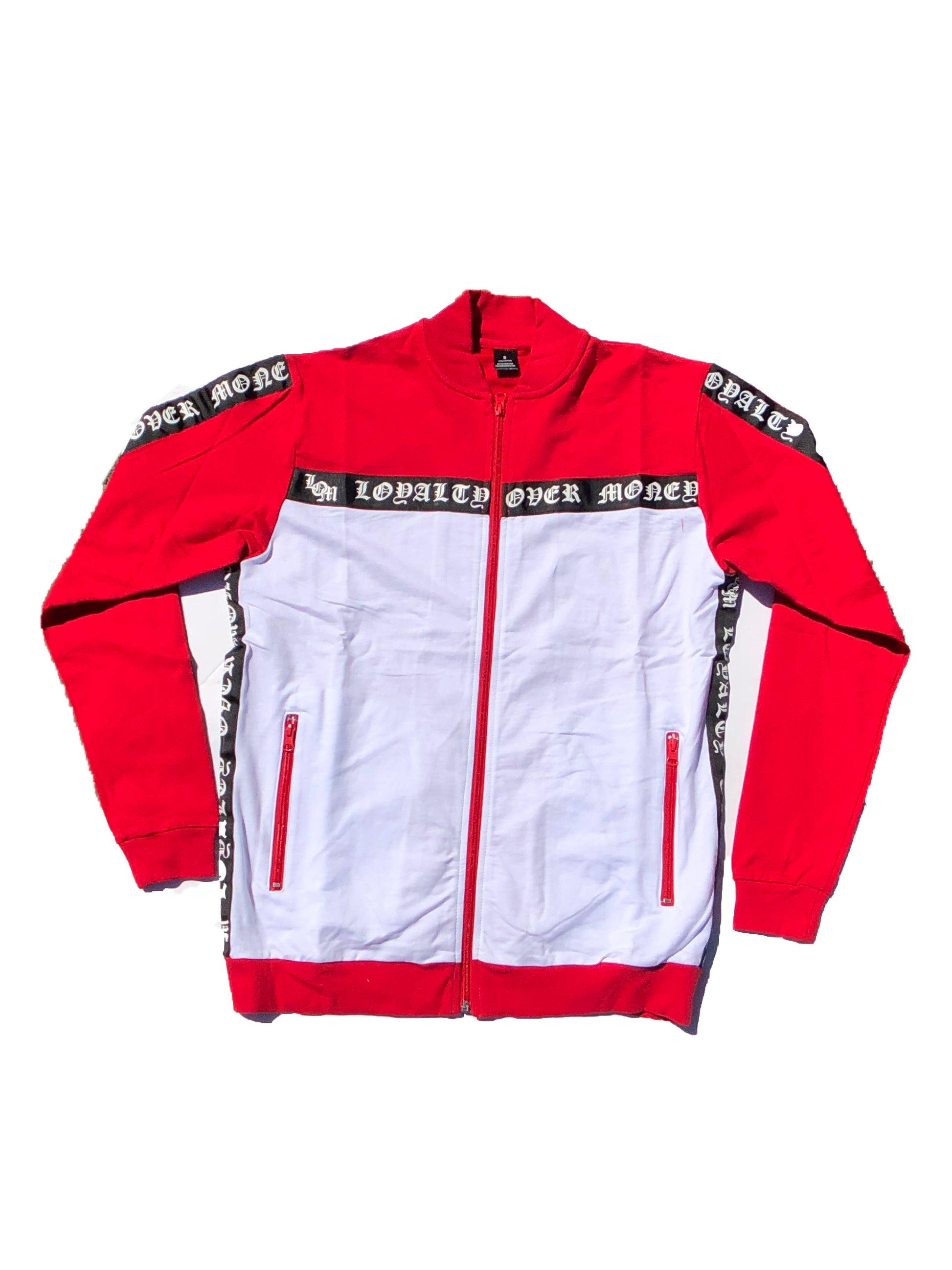 Red/white and black with loyalty over money going down both sides tracksuits.it has zipper on all the pockets and zippers at the bottom of the pants.