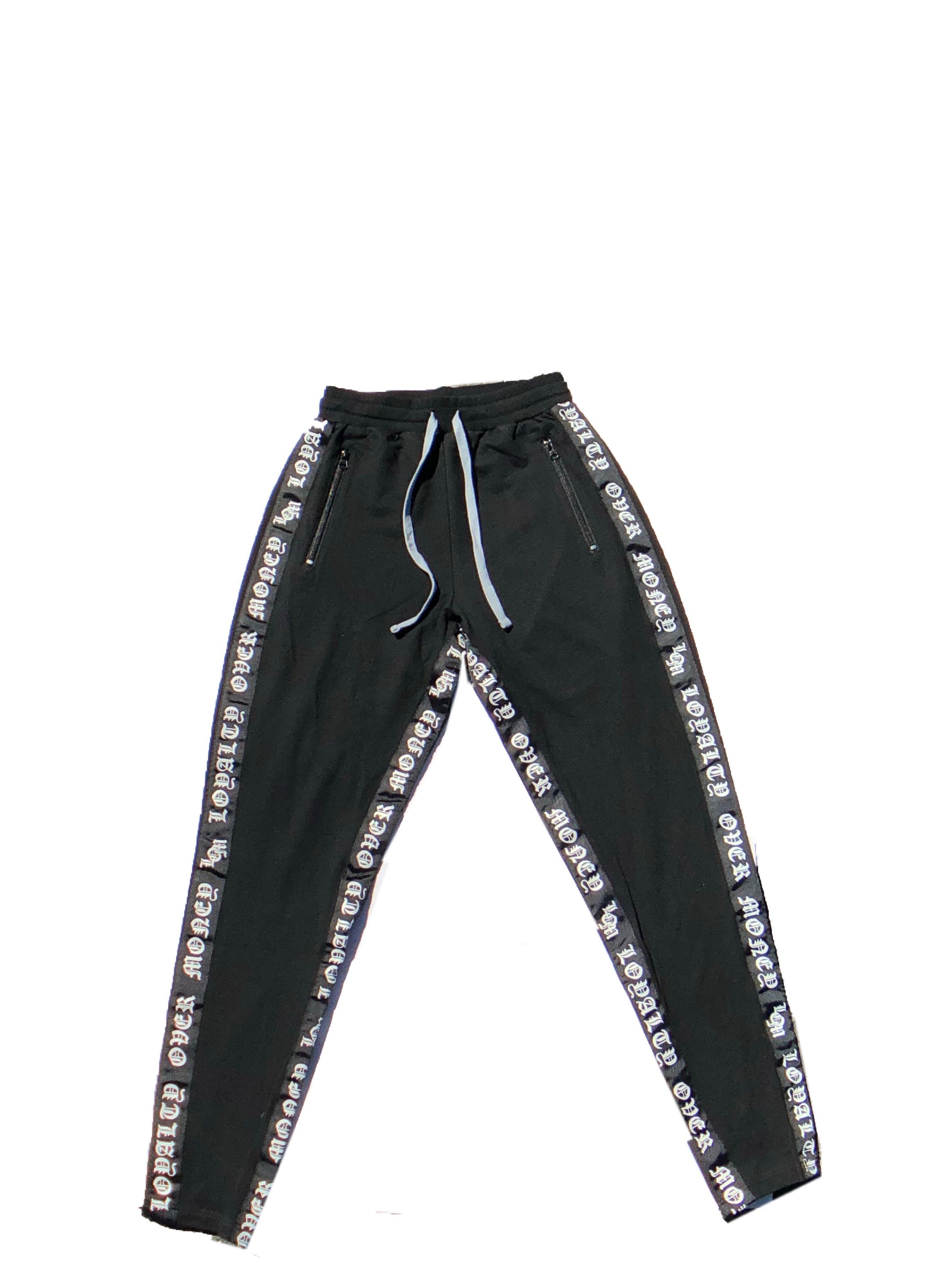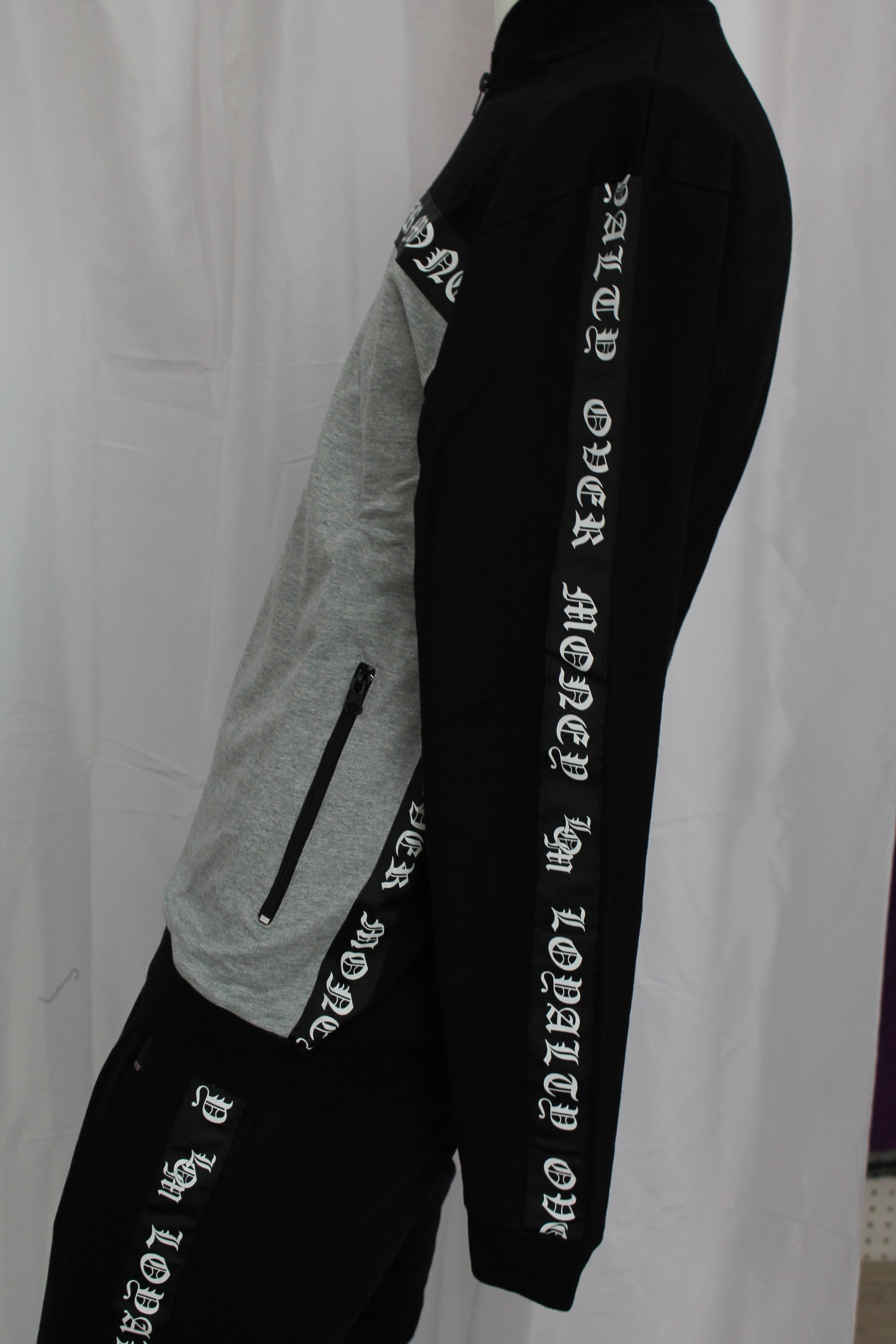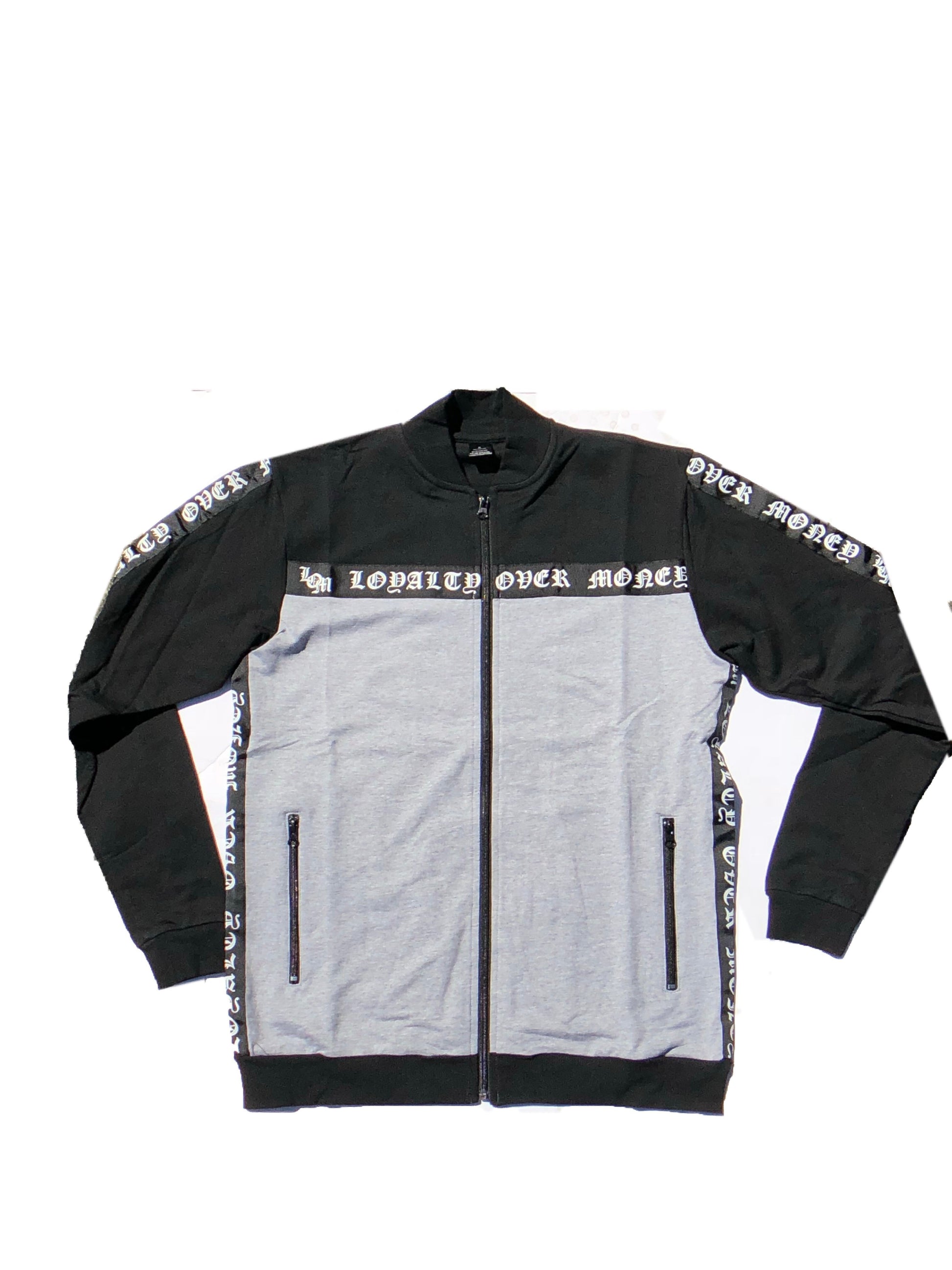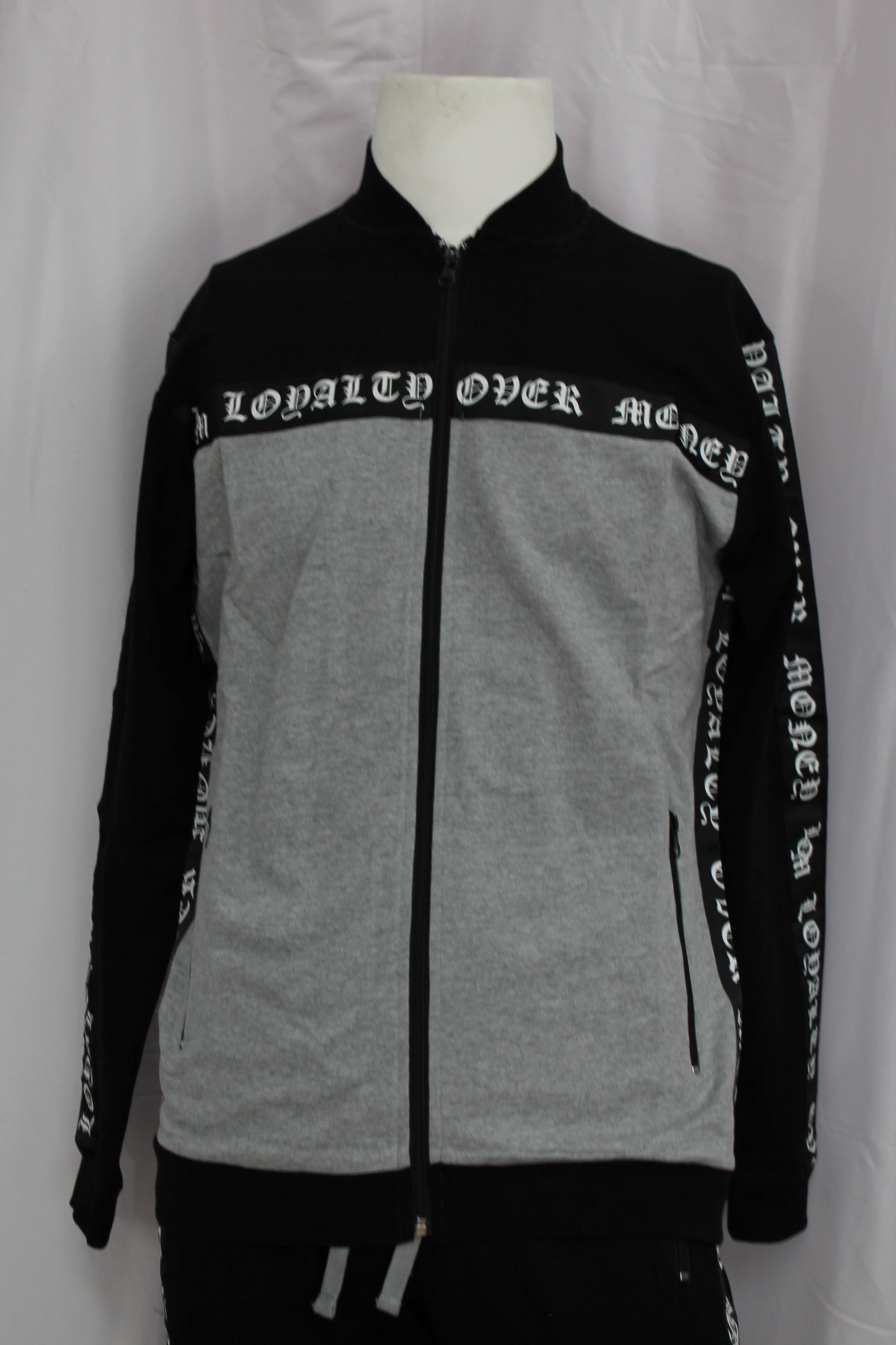Black/grey and white loyalty over money going down the side tracksuits.it has zippers on all the pockets and on the bottom of the pants,with the tie up strings on the waist