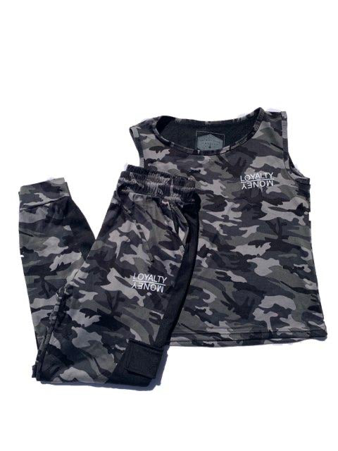 Sleeveless grey/black fatigue cargo jogger set.comfortable relaxed fit with pockets on the legs..with the famous loyalty over money logo on the top chest and thigh on the leg